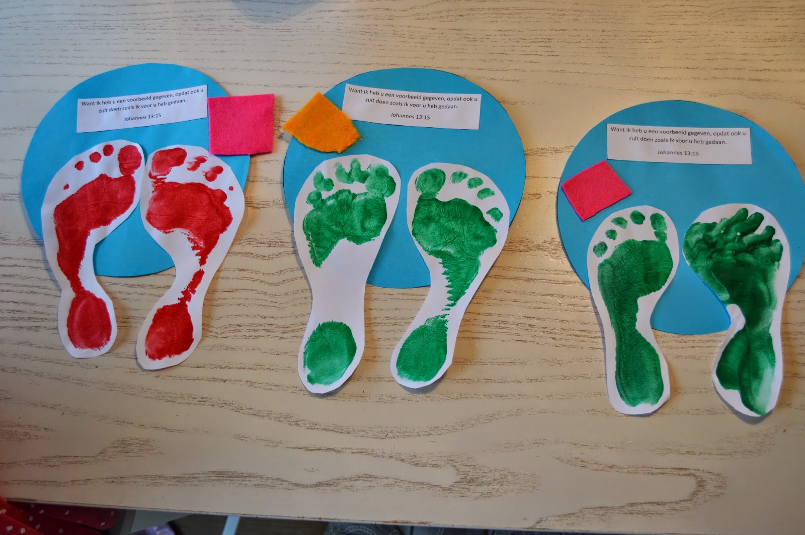 Tot slot maakten we een heel leuk werkje, waarbij er een voetafdruk met verf gemaakt moest worden. Daarna konden ze gelijk elkaars vieze voeten schoonwassen. Wat een pret ;).