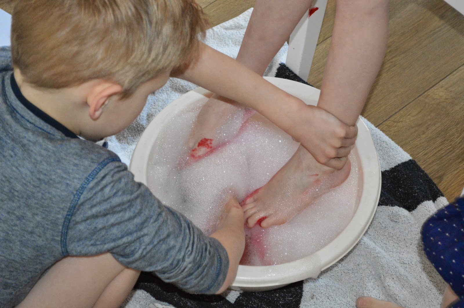 Toen vertelde ik het verhaal van de voetwassing. De kinderen waren wat wiebelig, maar gelukkig is dit een verhaal wat je mooi uit kan beelden tijdens het vertellen, en zo konden ze het toch opbrengen om hun aandacht erbij te houden.