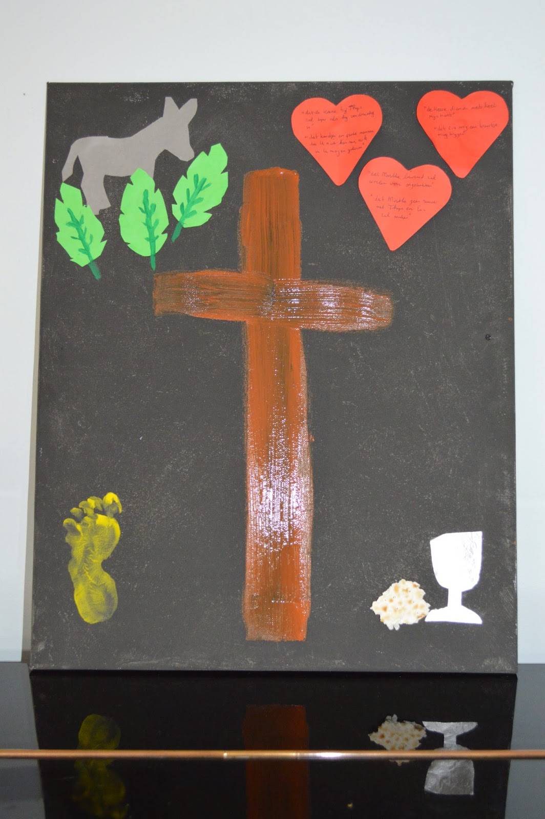 Ook verfden we een groot kruis op ons schilderij. De kinderen zijn erg trots op het resultaat.