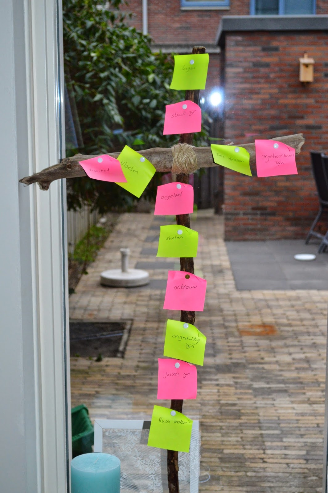 Met Goede Vrijdag hebben we uiteraard aandacht besteed aan de kruisiging. We vertelden het verhaal en maakten van 2 stokken en touw een kruis. Daarna hebben we onze zonden erop geplakt. Daarvoor stierf de Heere Jezus. Het kruis staat hier nu voor het raam in de woonkamer.